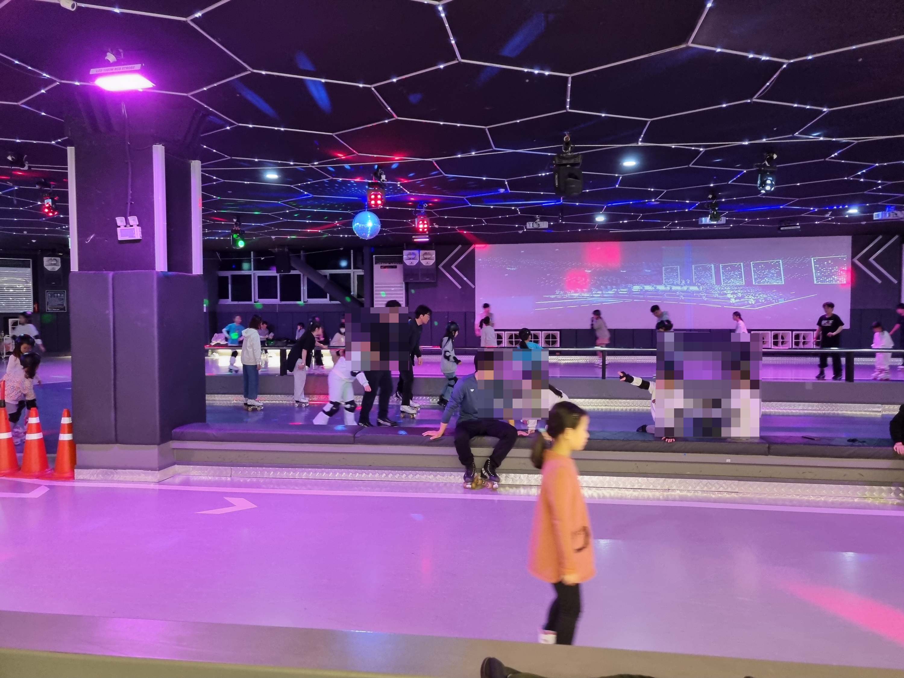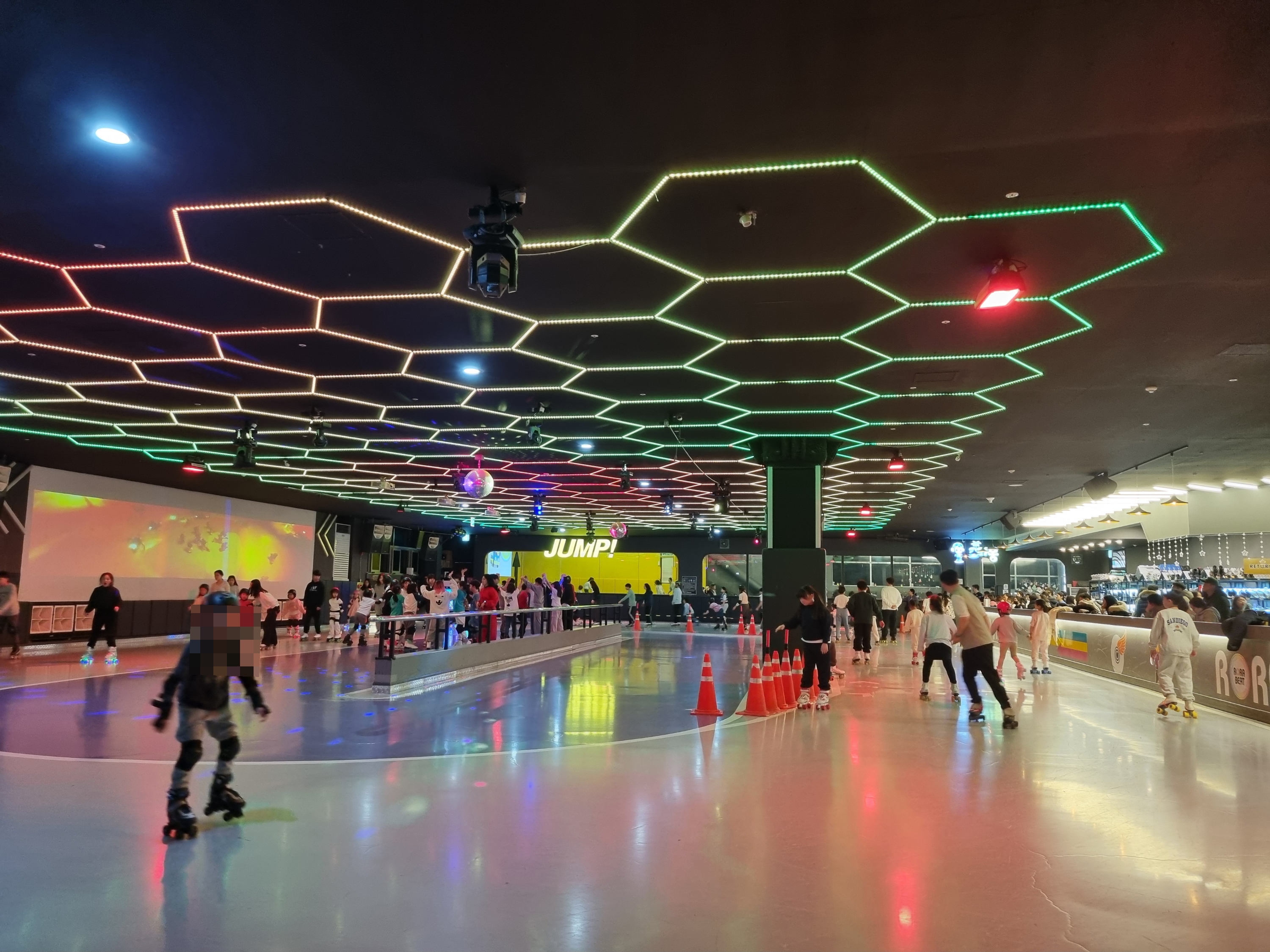 아이는 처음이라 보조기구가 있는 로라몽에 들어가 기구의 도움을 받아 20분 정도 연습을 하고 롤러스케이트장으로 나왔다. 로라몽 안쪽에는 키 150cm 이하만 들어갈 수 있는 트램폴린이 설치되어 있는데 어린 친구들이 폴짝폴짝 뛰는 모습에 우리 아이들 어렸을 적 키즈카페에 가서 즐거워했던 그때가 생각났다. 힘들면서도 행복했었을 때~^^!!