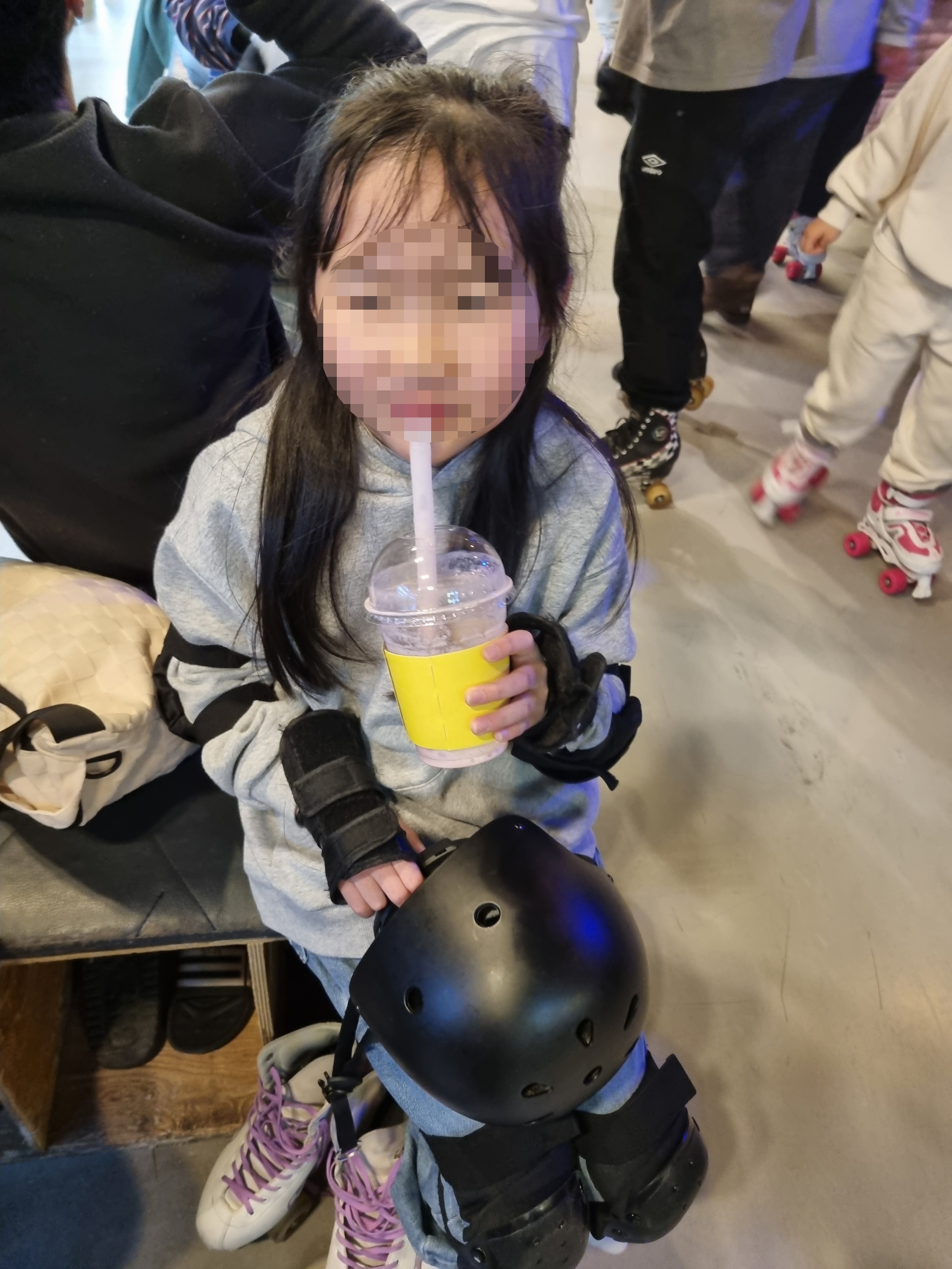 구경하고 돌아와 아이가 쉬고 있는 곳으로 갔다. 땀이 찬 헬맷을 벗고 시원한 딸기스무디를 먹는 아이에게 더 타고 싶은지 물어보았다. 돌아오는 대답은 넘어진 곳이 아프다며 더 타지는 못하겠다고 해서 롤러스케이트와 보호장구를 반납하고 나왔다. 대략 한 시간 정도 이곳에 있었던 거 같은데 아이에게 짧은 시간이었지만 좋은 경험이 되었고 언젠가는 이번경험이 도움이 되는 일이 있을 것이라고 생각한다.^^ 롤러스케이트를 사려던 마음은 접었지만 다음에 또 와서 연습을 하고 싶다고 말했다.^^