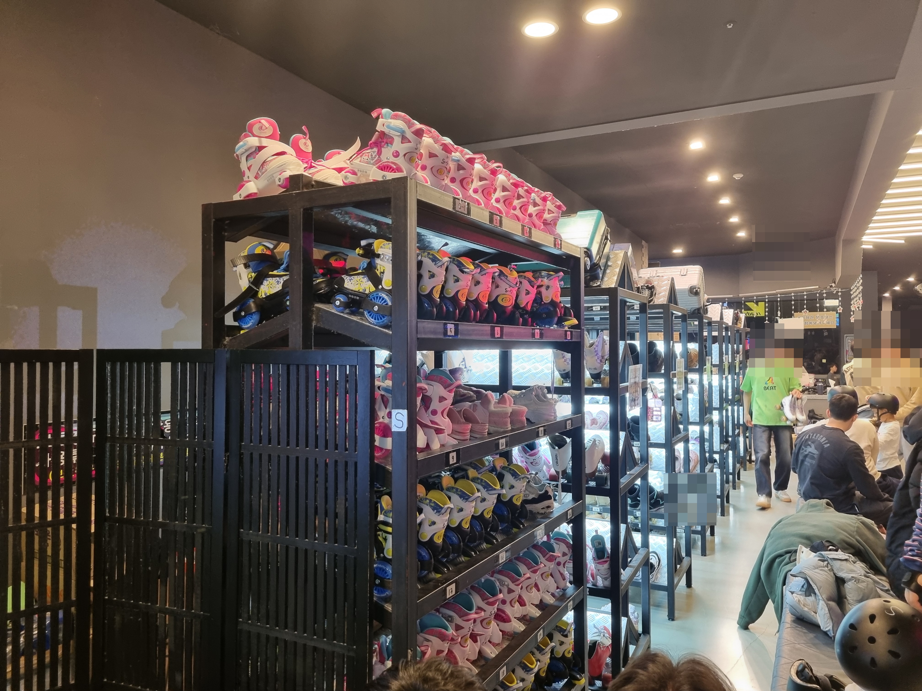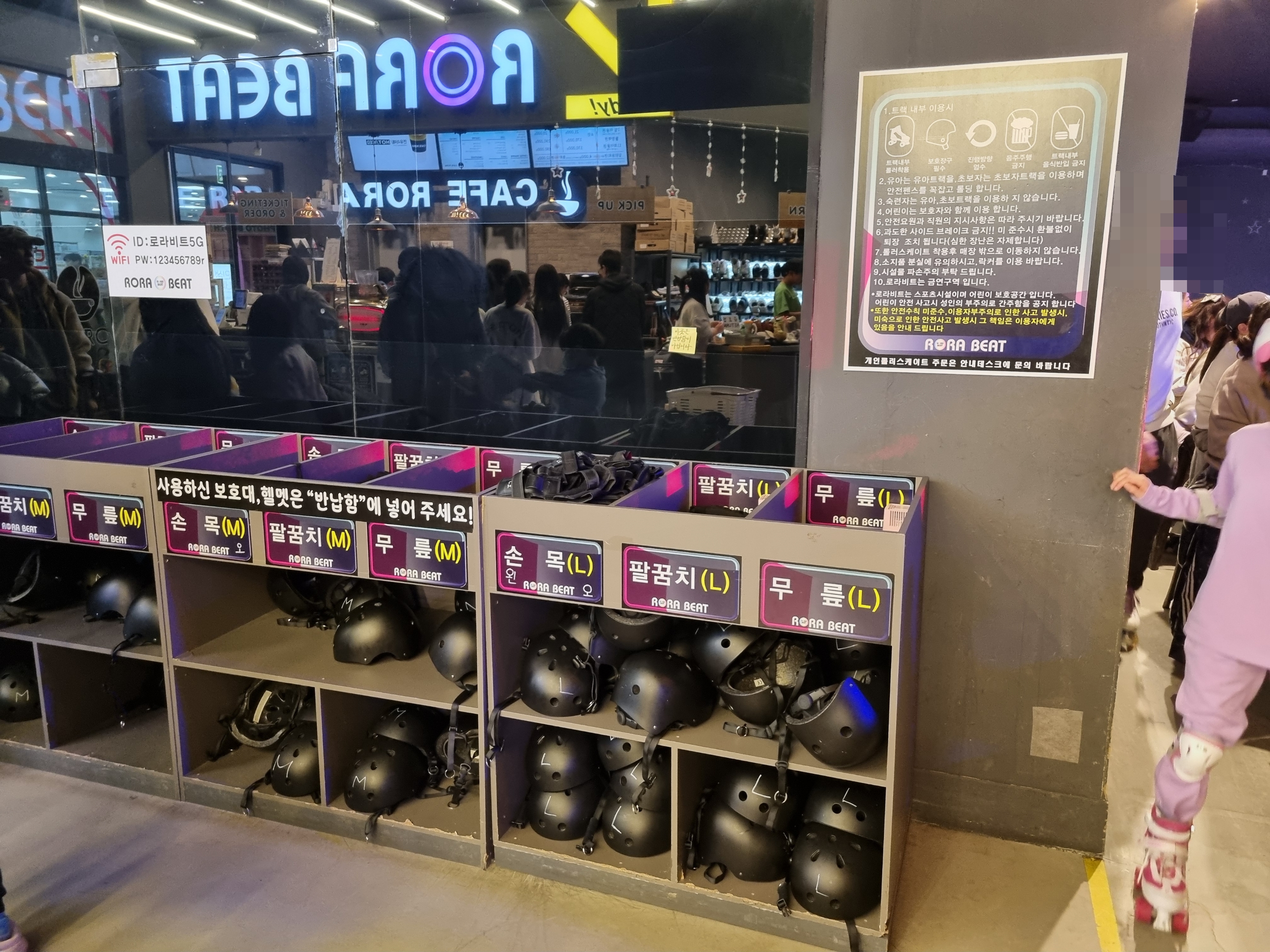 롤러스케이트 타는 법을 가르쳐줄 아이아빠와 딸은 직원분의 도움을 받아 발사이즈에 맞는 롤러스케이트를 착용하고 보호대가 있는 곳으로 이동해서 헬멧, 손목, 팔꿈치, 무릎 보호대를 스스로 자신에게 맞는 사이즈를 찾아 착용했다. 보호대 착용하는 곳에는 5~6명이 앉아서 착용할 수 있는 의자가 놓여 있었지만 이날은 사람이 많아 우리는 서서 착용했다.