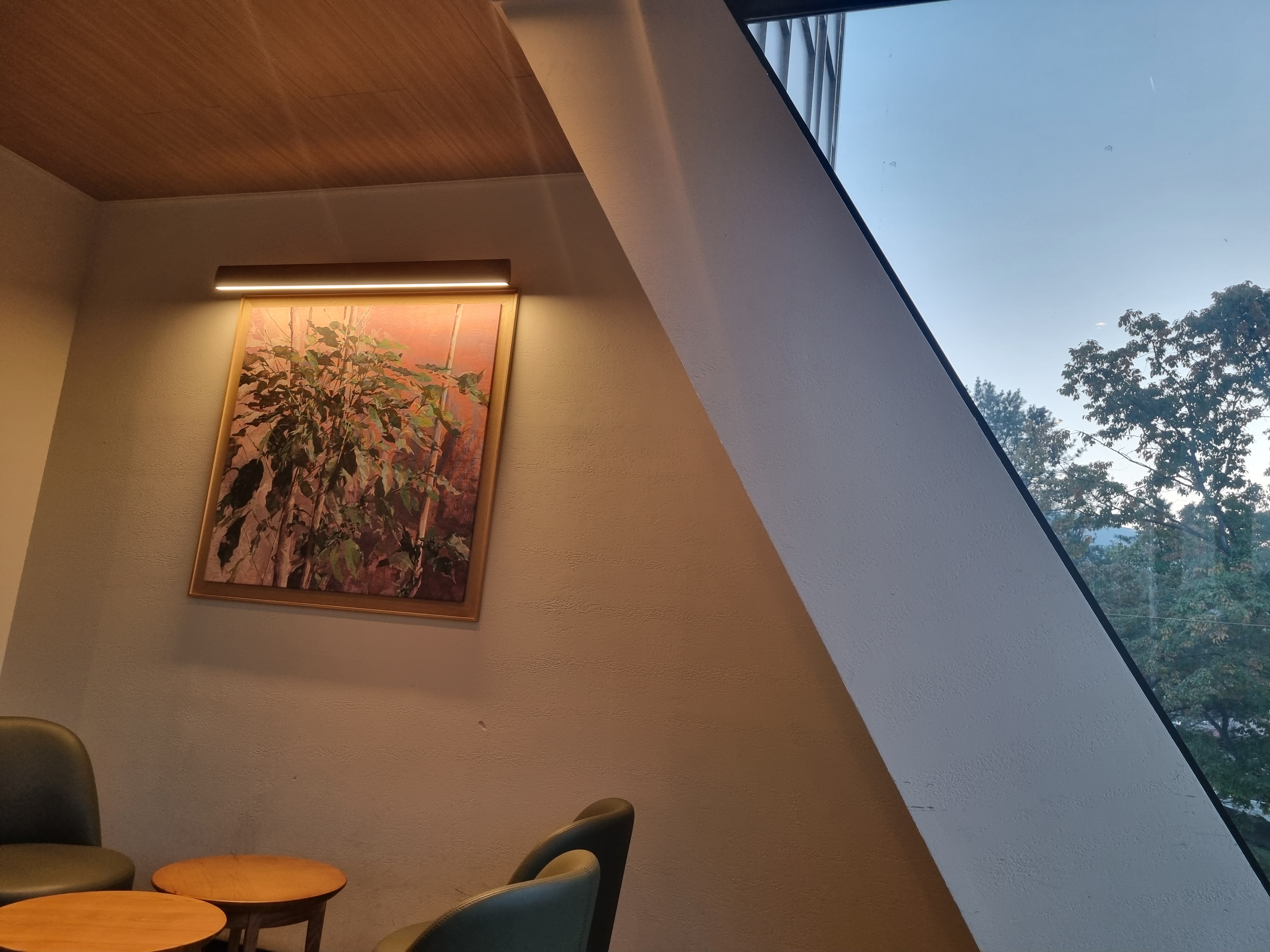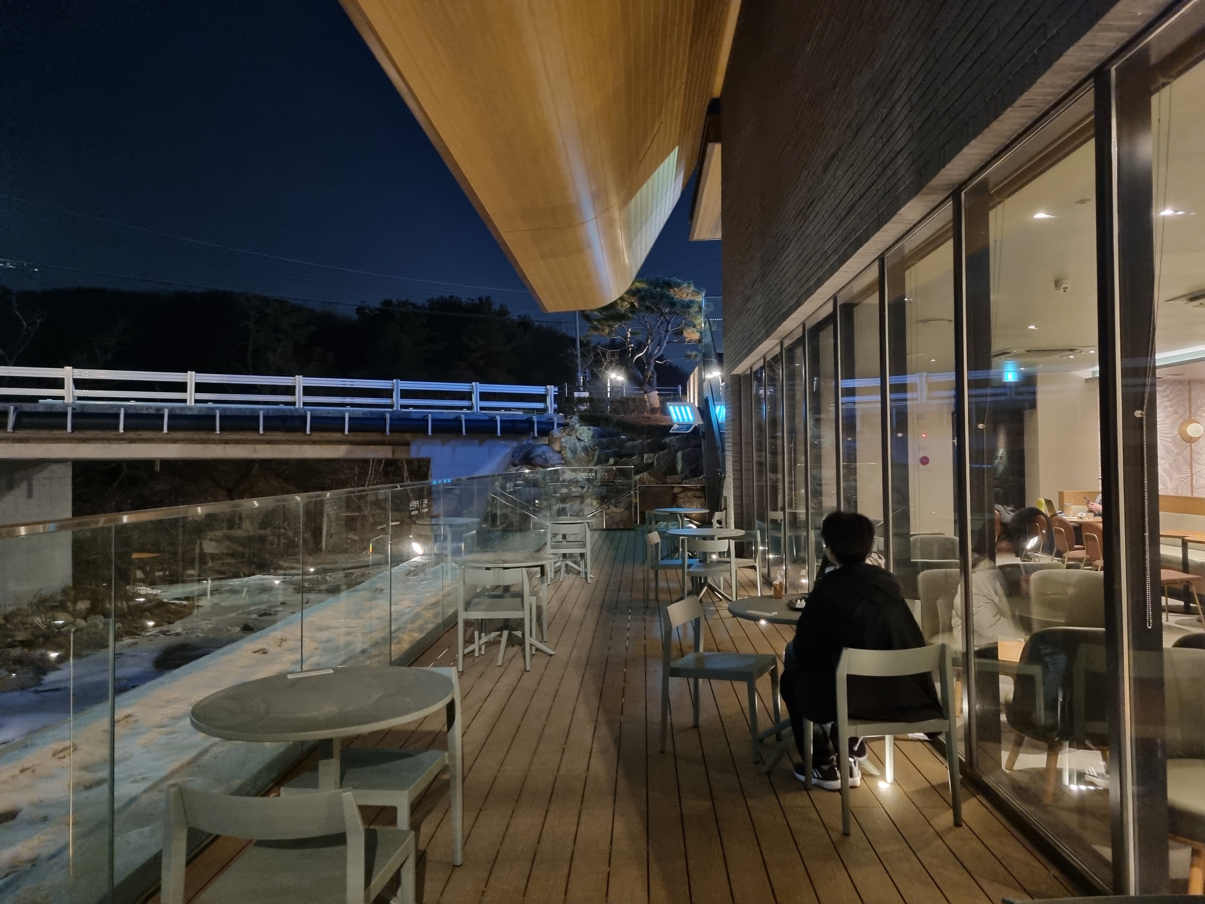 매장은 지하 1층, 1층, 2층 이렇게 세 개 층으로 되어있고 1층 야외에는 키가 큰 소나무 사이로 테이블 좌석도 많았다. 처음 방문했을 때 1층 야외 테이블에 앉았었는데 이곳에 앉아 있으면 시간 가는 줄 모르고 있을 수 있을 것 같았다. 두 번째 방문 때는 2층에 앉았었는데 매장 안에 걸려 있는 그림들을 보는 재미가 있었고 세 번째 방문 때는 지하 1층 야외의 쌓인 눈과 어우러진 야경이 예뻤다.