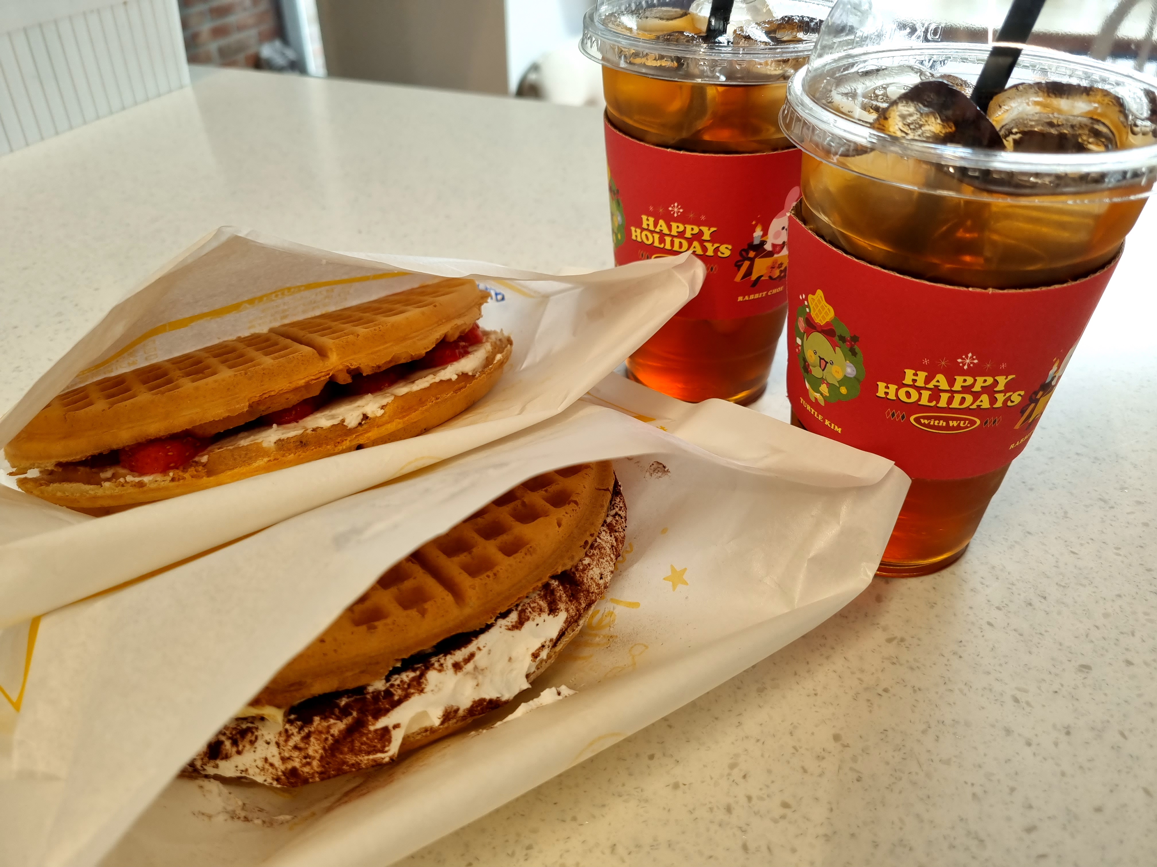 쿠팡잇츠로 주문한 딸기와플, 티라미수와플, 복숭아 아이스티, 솜사탕 젤라또컵, 망고 젤라또컵!! 직접 가서 사 오면 조금 더 낮은 가격으로 먹을 수 있지만 집에 있고 싶어 배달 주문을 했다. 배달시킬 때와 직접 가서 구매할 때 가격 차이가 있어 아쉽지만 편하게 먹을 수 있는 장점도 있어 종종 배달을 이용하고 있다. 와플대학이 들어오면서 쭉 아이들 단골이 된 곳인데 몇 달 전 매장에서 사장님이 알아보시고 인사를 건네주신 곳이다. 아마도 매번 똑같은 메뉴와 개수 때문에 알아보신 것 같다. 사장님도 엄청 친절하시고 주문한 메뉴를 항상 깨끗하게 만들어 주시고 담아주신다. 다른 지점에서도 먹어봤지만 지점마다 맛이 다른듯하다. 대장동 와플대학이 맛있는 이유가 바삭한 와플에 속재료 비율을 맛있게 잘 맞춰주시는 것 같다.^^