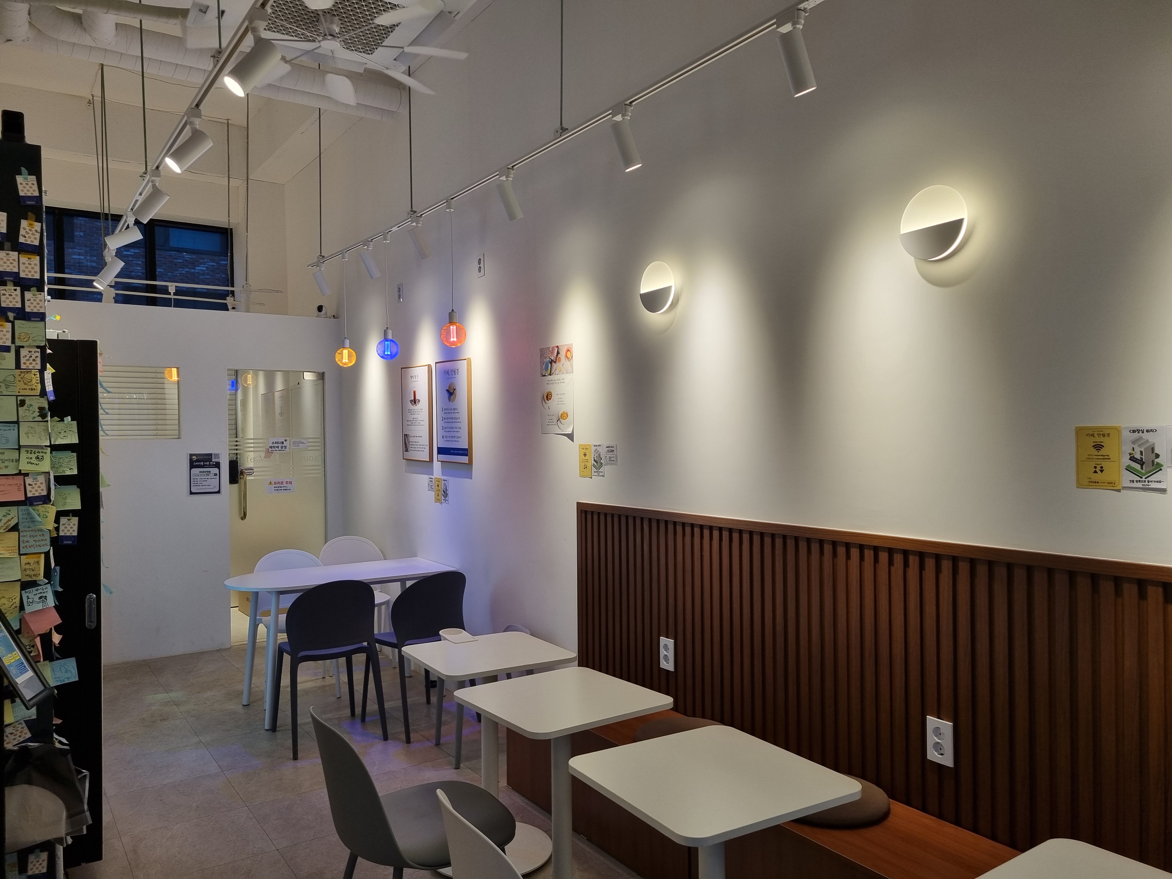 무인카페 내부에는 개인의 용무에 따라 사용할 수 있는 스터디룸이 있다. 4인용 테이블이 있고 1인에서 4인까지 이용할 수 있다. 벽이 세워져 있지만 천정까지 막혀 있지 않기 때문에 공간분리의 느낌으로 생각하면 좋을 거 같다. 냄새가 나지 않는 간단한 스낵 및 음료 섭취는 가능하고 음식물 쓰레기가 나오거나 냄새나는 음식물은 불가한다고 되어있다.